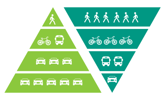 היפוך פירמידת התחבורה כולל צמצום שימוש ברכב הפרטי ככל הניתן ועידוד השימוש בהליכה ברגל, רכיבה על אופניים ושימוש בתחבורה ציבורית.